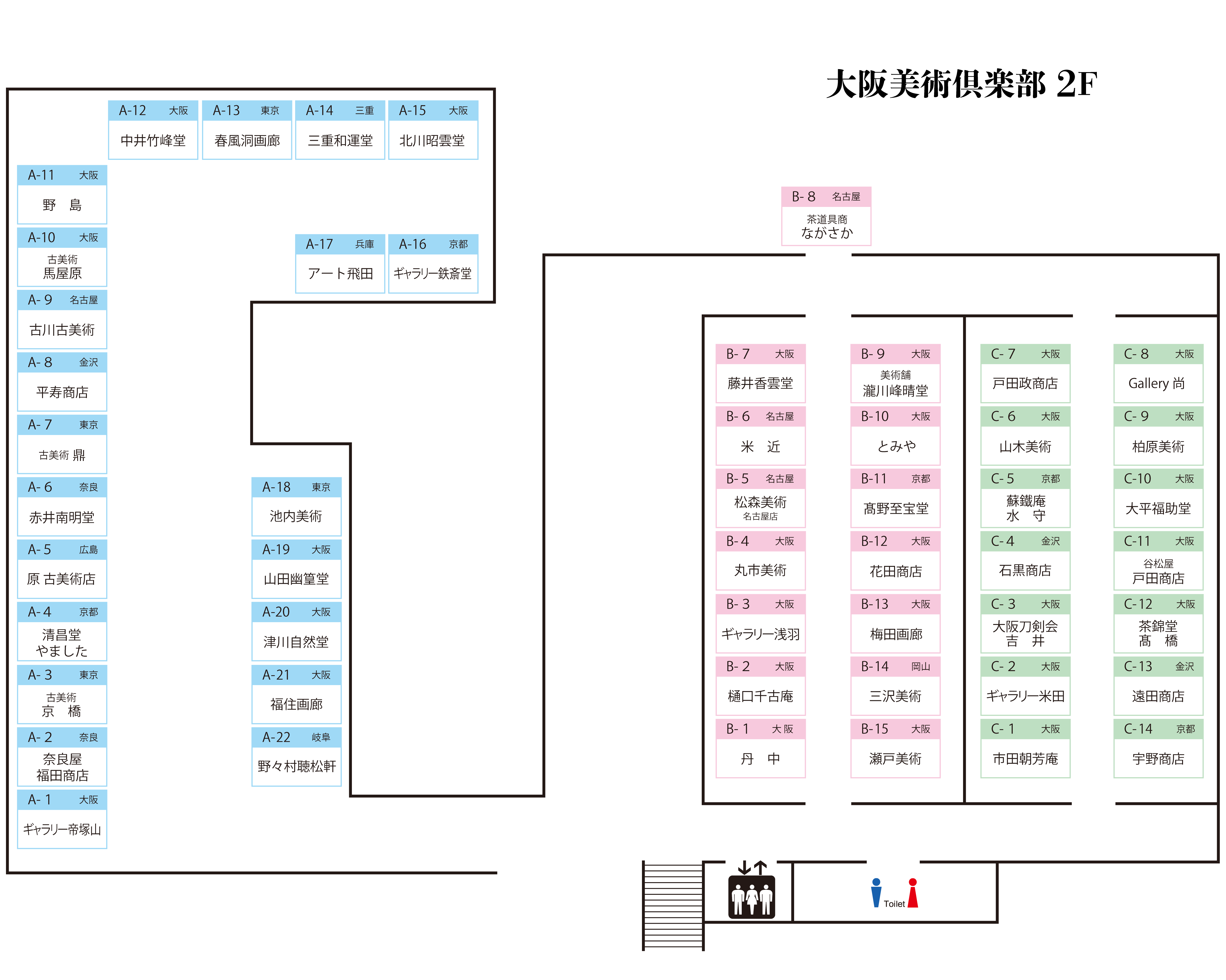 A-1 ギャラリー帝塚山 A-2 奈良屋 福田商店 A-3 古美術 京橋 A-4 清昌堂やました A-5 原 古美術店 A-6 赤井南明堂 A-7 古美術 鼎 A-8 平寿商店 A-9 古川古美術 A-10 古美術 馬屋原 A-11 野 島 A-12 中井竹峰堂 A-13 春風洞画廊 A-14 三重和運堂 A-15 北川昭雲堂 A-16 ギャラリー鉄斎堂 A-17 アート飛田 A-18 池内美術 A-19 山田幽篁堂 A-20 津川自然堂 A-21 福住画廊 A-22 野々村聴松軒 B-1 丹 中 B-2 樋口千古庵 B-3 ギャラリー浅羽 B-4 丸市美術 B-5 松森美術 名古屋店 B-6 米 近 B-7 藤井香雲堂 B-8 茶道具商ながさか B-9 美術舗 瀧川峰晴堂 B-10 とみや B-11 髙野至宝堂 B-12 花田商店 B-13 梅田画廊 B-14 三沢美術 B-15 瀬戸美術 C-1 市田朝芳庵 C-2 ギャラリー米田 C-3 大阪刀剣会 吉井 C-4 石黒商店 C-5 蘇鐵庵 水守 C-6 山木美術 C-7 戸田政商店 C-8 Gallery尚 C-9 柏原美術 C-10 大平福助堂 C-11 谷松屋 戸田商店 C-12 茶錦堂 髙橋 C-13 遠田商店 C-14 宇野商店