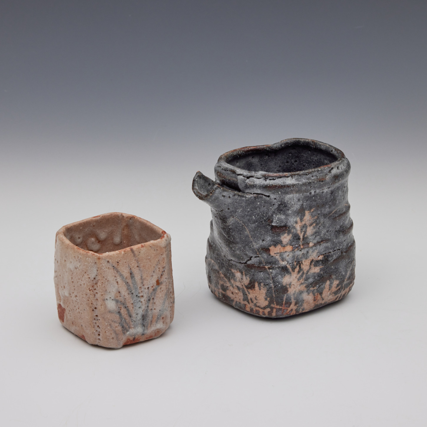 <C-13>遠田商店 志野草文四方猪口/鼠志野片口 瀧川恵美子 片口:高8.5|幅6.0×10.5 猪口:高5.7|口径5.0×5.0 遠田商店 店舗〒920-0854 石川県金沢市安江町3-13 TEL 076-255-1729 【C】ブース ギャラリーアーカイブ NEXT
