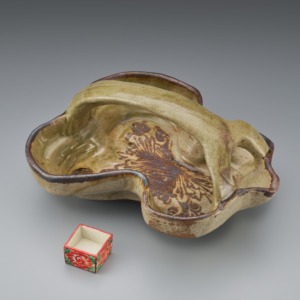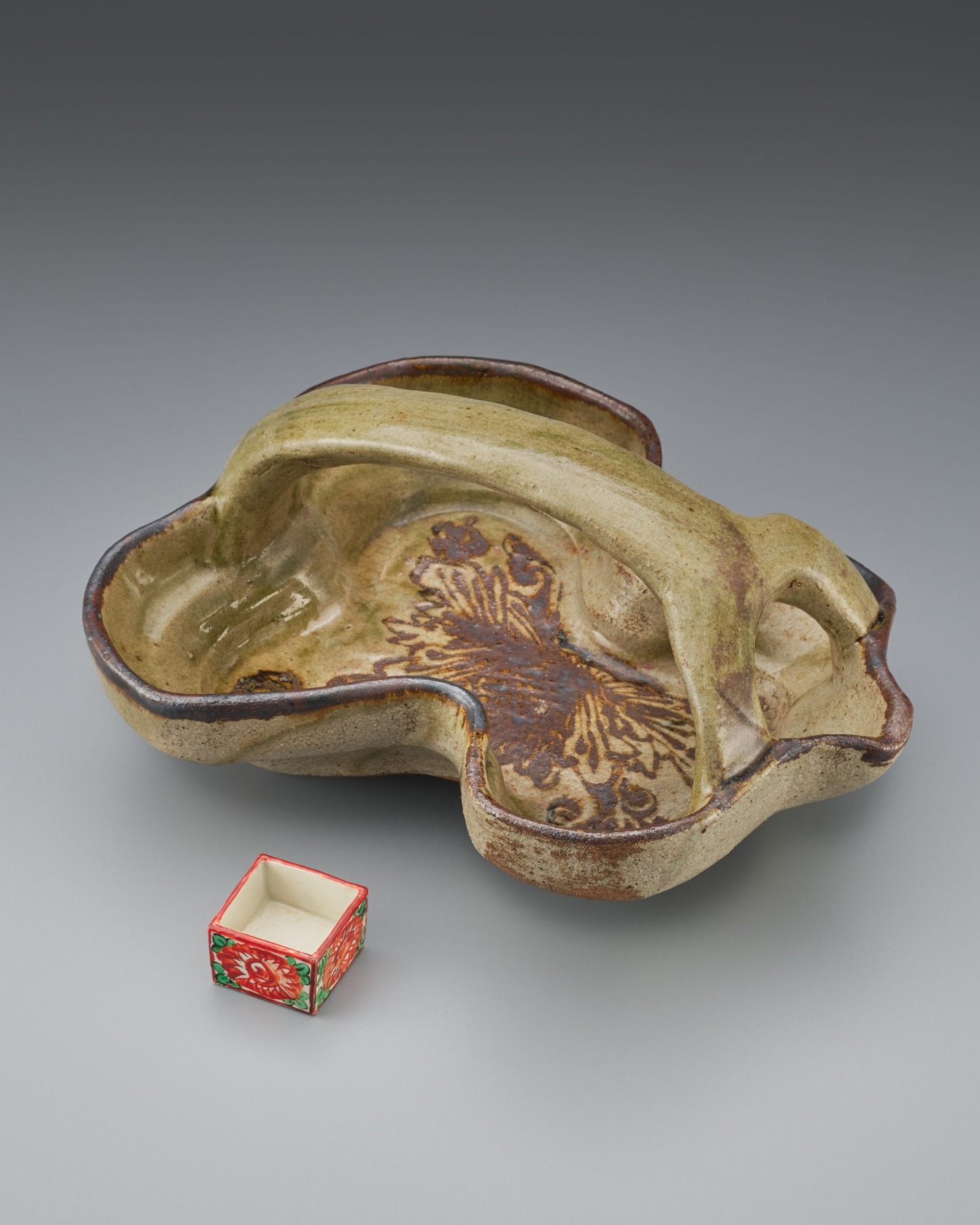 A-9 藤井香雲堂 青木木米倣呉洲赤絵 升酒杯 江戸時代後期 竹軒旧蔵 織部写 手鉢 天保3年(1832)春 〈 倣呉洲赤絵 升酒杯 〉:幅:3.5×3.5cm 高さ:2.5cm 木米の盃として有名な作品のひとつとして知られます。大阪の豪商で文人蒐集家として知られた横江萬治郎(号・竹軒)の旧蔵品で昭和10年に東美と大美で行われた売立目録に掲載。昭和16年に名古屋の信友(近藤友右衛門)の売立が行われた際には同手が4300円での落札と記録されております。 〈 織部写 手鉢 〉:幅26.0×21.5cm 高さ:12.8cm 木米による桃山陶である織部の写しは数点のみ存在が確認されております。当作品は木米の没年の前年の作であることが本人により刻まれており、資料的価値としても高いものです。 藤井香雲堂 店舗596-0078 大阪府岸和田市南上町1-6-12 TEL 072-422-1917 Webwebsite Mailcontact SNSinstagram 他 店舗<出張所:BASE215> 〒556-0006大阪市浪速区日本橋東2-1-5 大阪南美術館内 【A】ブース ギャラリーアーカイブ PREVIOUS NEXT