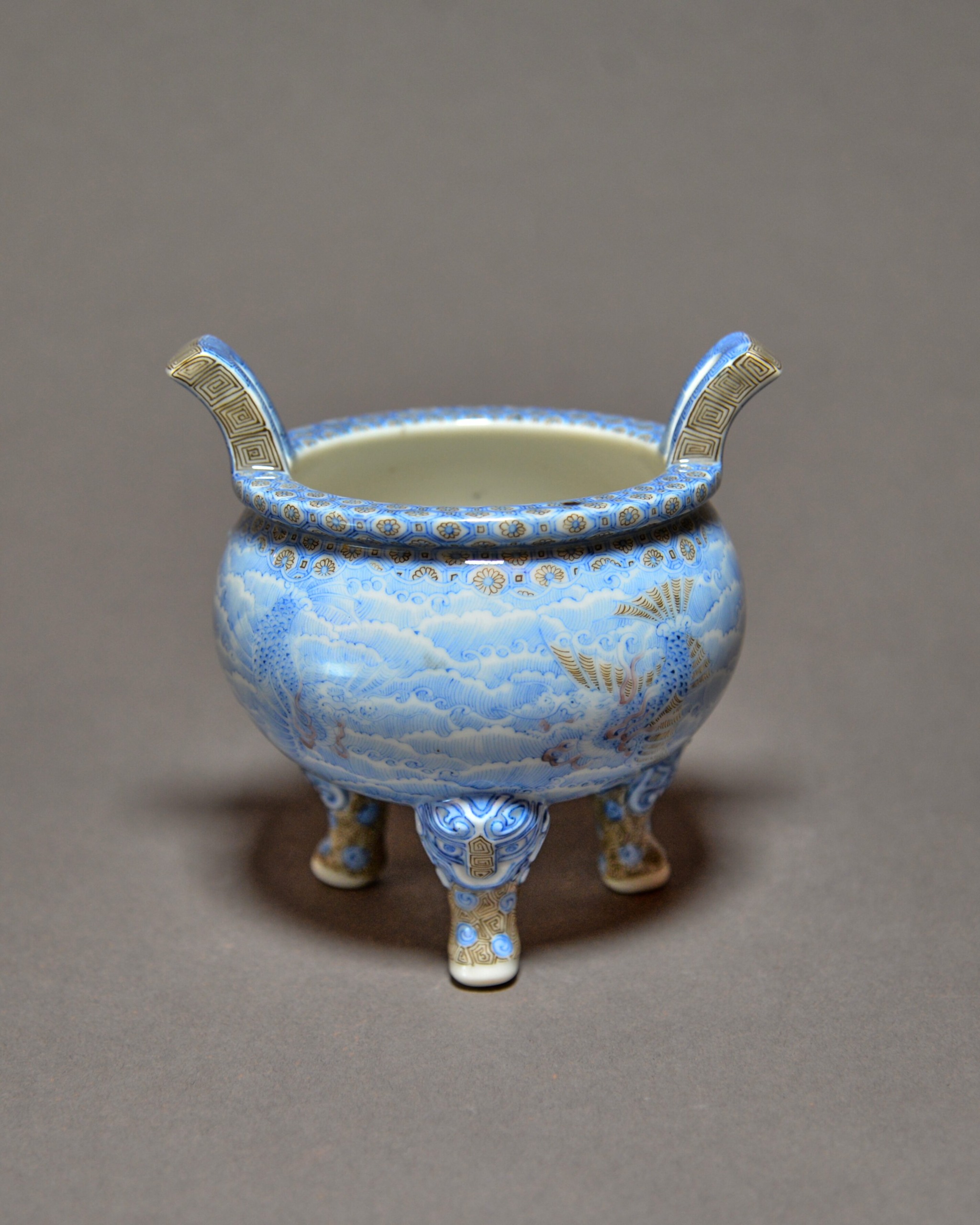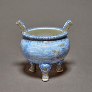 釉下彩波に龍神文手付香炉